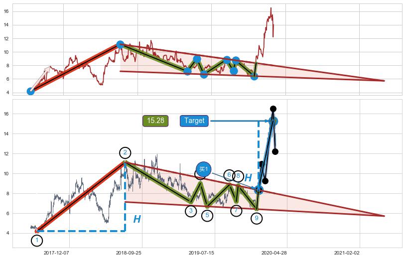 ➣ 降楔型:上涨目标target已达成:猜想强阻力位临近,预期回调下跌(均值回复)