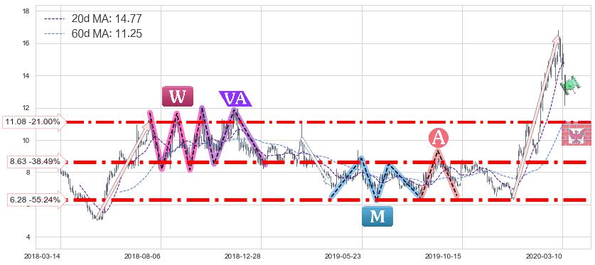 ♘ 支撑价格位11.08,可信任强度78.46%,距离最后交易2020-03-13形成的收盘价格14.03相差 -21.00%