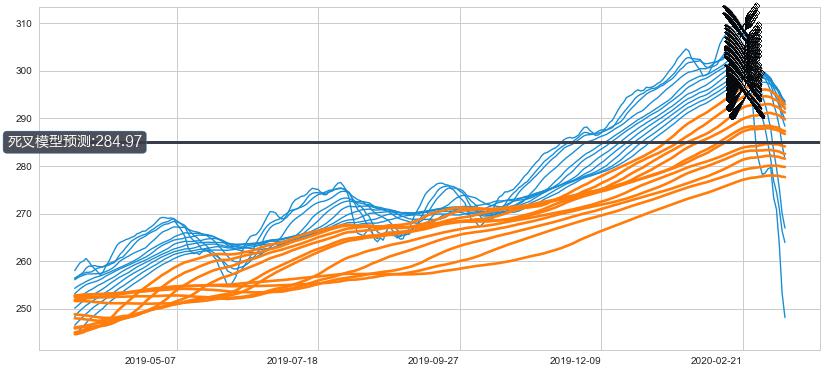➢ 70小时均线于(2020-02-21: 296.31)形成【死叉】基于【死叉历史模型】预测死叉后最低波谷价格: 275.82, 死叉后最低价格226.48,已经下跌超出预测最低波谷价格, 预期反弹
