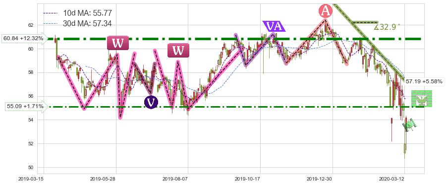 ♘ 阻力价格位55.09,可信任强度64.20%,距离最后交易2020-03-13形成的收盘价格54.17相差 +1.71%