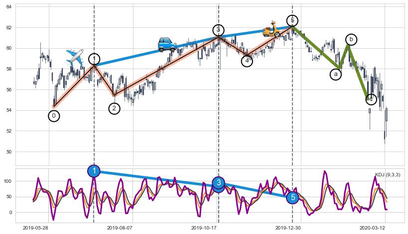 ➢ 第一, 三驱动浪端点:【KDJ】走势出现【常规背离 & 反转信号】背离程度99.00%,背离夹角角度61.5˚,背离程度较大