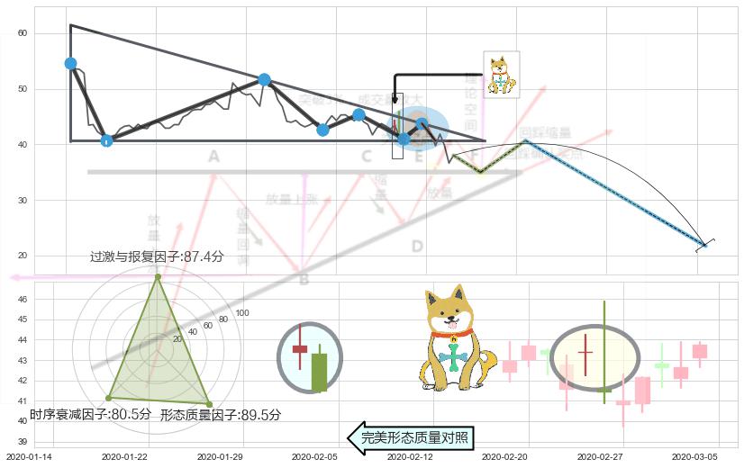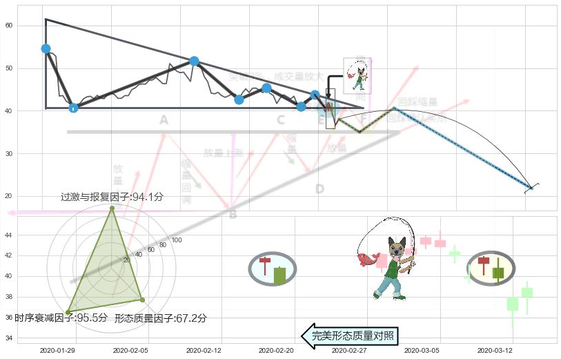 ➢ 【多方力量耗尽,空方打破攻守平衡点】下降三角形中继整理, 已在2020-03-09突破【支撑】颈线 40.66 →演变成下降通道