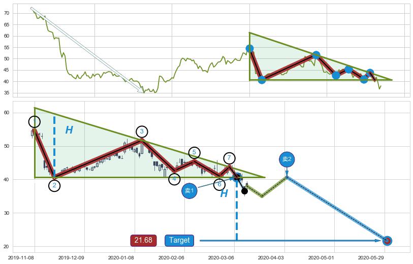 ➣ 下降三角整理:关键支撑位被击穿 → 猜想形成趋势持续下跌 → 风险信号 → 大趋势均值回复