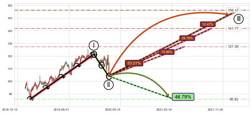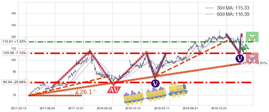 ♘ 支撑价格位105.96,可信任强度90.50%,距离最后交易2020-03-13形成的收盘价格114.10相差 -7.13%