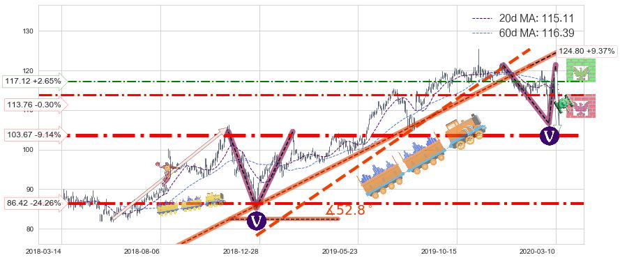 ♘ 阻力价格位117.12,可信任强度53.69%,距离最后交易2020-03-13形成的收盘价格114.10相差 +2.65%