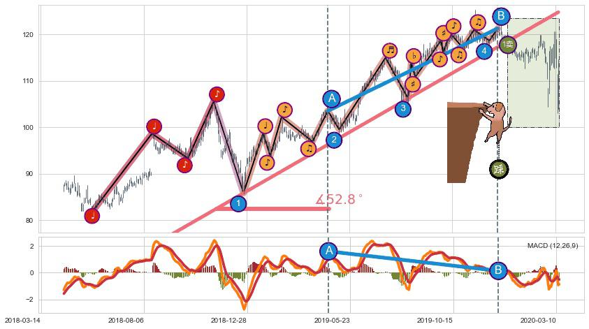 ➣ 2018-05-29-2020-01-31上升趋势存在反转[风险],其原上升趋势的支撑位(124.80)已破位[强阻力信号],原上升趋势角度: 52.8˚