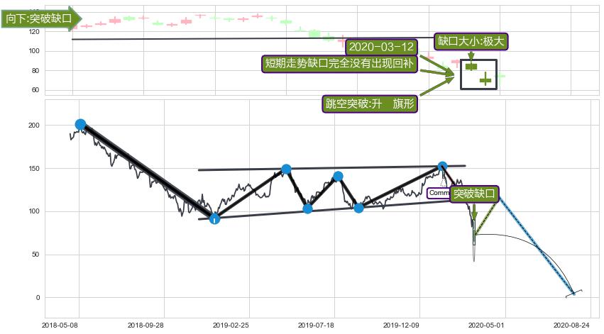 从2018-05-10至2020-03-13,共包含464个交易日,阶段股价下跌-81.06%,阶段股价变动位移路程比: 1 : 12,下跌趋势角度: 21.5