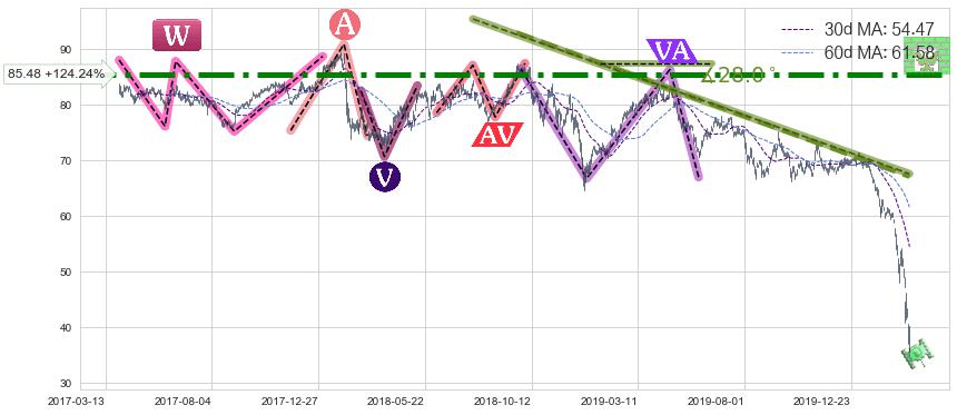 ♘ 阻力价格位85.48,可信任强度99.00%,距离最后交易2020-03-13形成的收盘价格38.12相差 +124.24%