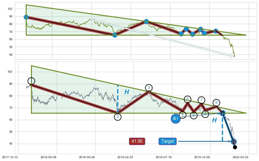 ➢ 【多方力量耗尽,空方打破攻守平衡点】下降三角形中继整理, 已在2020-01-27突破【支撑】颈线 65.51 →演变成下降通道