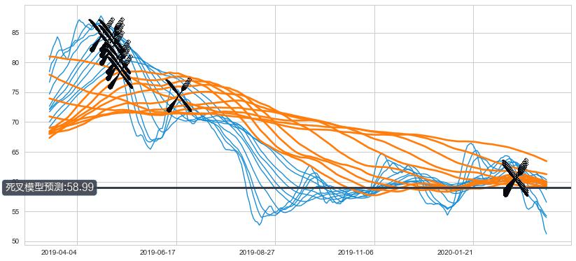 ➣ 60小时均线于(2019-05-03: 79.69)形成【死叉】基于【死叉历史模型】预测死叉后最低波谷价格: 70.42, 死叉后最低价格49.52,已经下跌超出预测最低波谷价格, 预期反弹