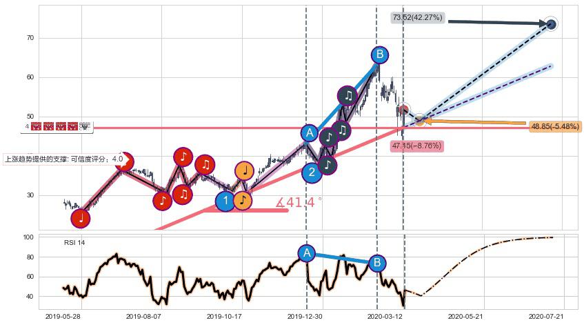 ♘ 在最后的上升阶段2019-05-29至2020-03-11存在 持续未破位的支撑位 ,支撑价格47.15,支撑可信任强度83.67%,其距离最后价格51.68相差 -8.76%
