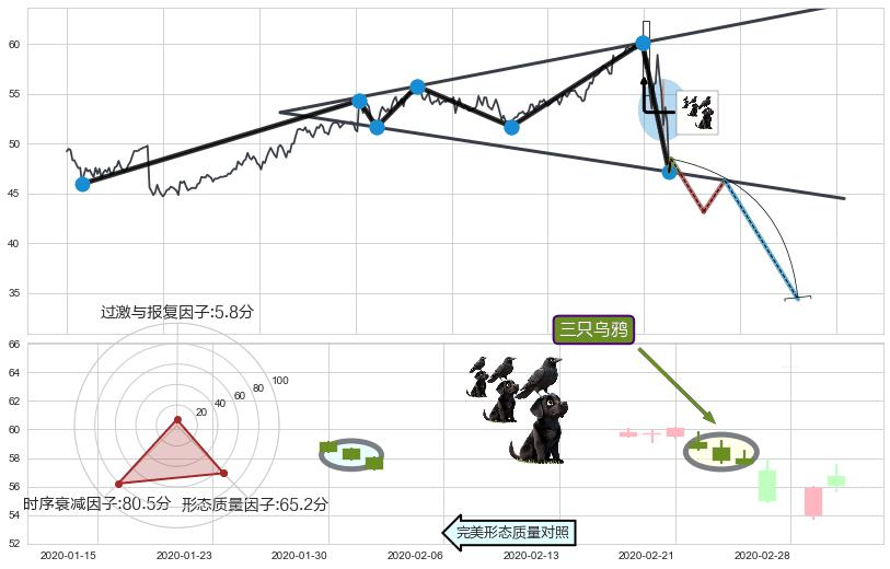 ➢ 三只乌鸦 🔜 扩散三角反转临近支撑猜想转换阻力下跌 综合量化分数:47.26 【中性】