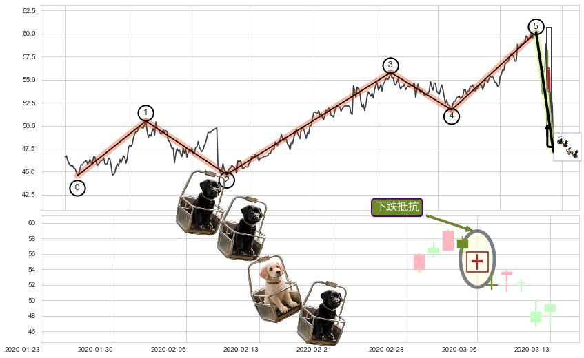 ➢ 趋势线:向下小回调迎来关键支撑位,猜想强支撑位失守破位,下行击穿原上涨趋势 → 下跌 →【破位】风险信号 → 大周期均值回复