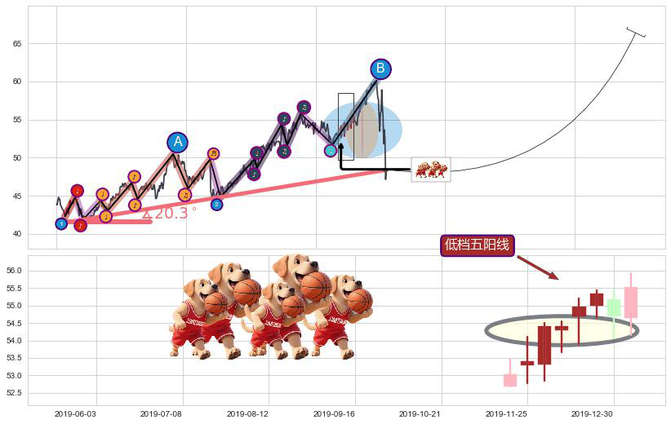 ➢ 🕰 价格走势在2019-11-25至2019-12-23期间形成低档五阳线,残存影响值:1.95