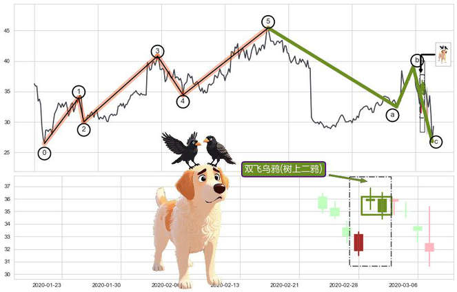 ➢ 双飞乌鸦(树上二鸦) 🔜 波浪理论击穿破位C点继续下跌 综合量化分数:43.50 【偏空】