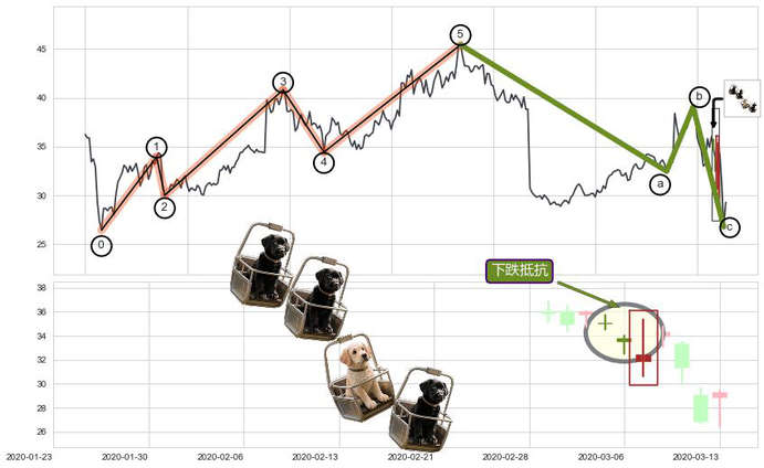 ➢ 波浪理论:猜想击穿破位c点后继续下跌 → 下跌 → 风险信号 → 小趋势跟踪