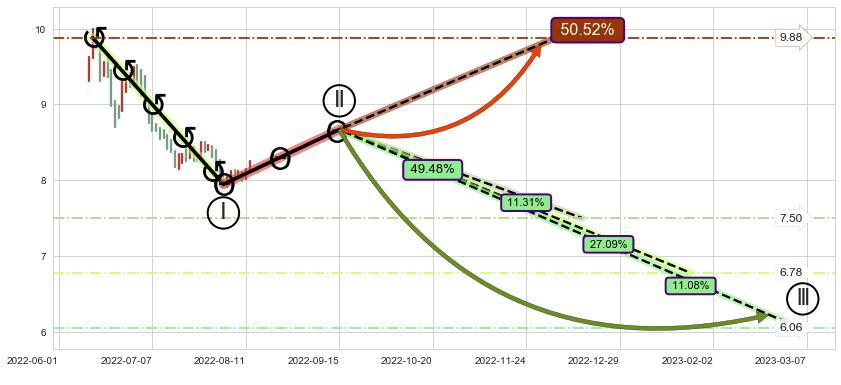 ➣ 循环浪继续向下【平均值】位置(2023-01-25, 6.78),匹配聚类样本比例54.75%, 可能性概率27.09%