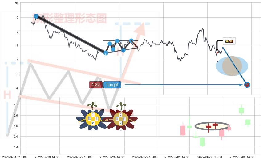 ➣ 升旗形:猜想预期下跌目标target即将达成,随后猜想强支撑来临,预期反弹上涨(均值回复)