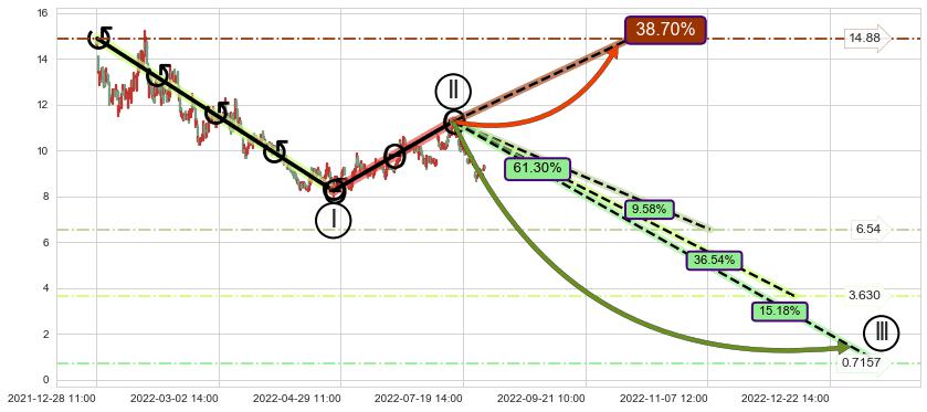 ➣ 调整浪已超过预测的c点位置,后续大趋势循环浪继续下跌概率61.30%,谨慎做多