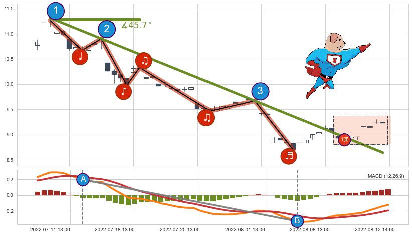 ➣ 2022-07-07 14:00-2022-08-11 14:00下跌趋势存在反转上涨[机会],其原下跌趋势的阻力位(8.64)已被突破[强支撑信号],原下跌趋势角度: 45.7˚