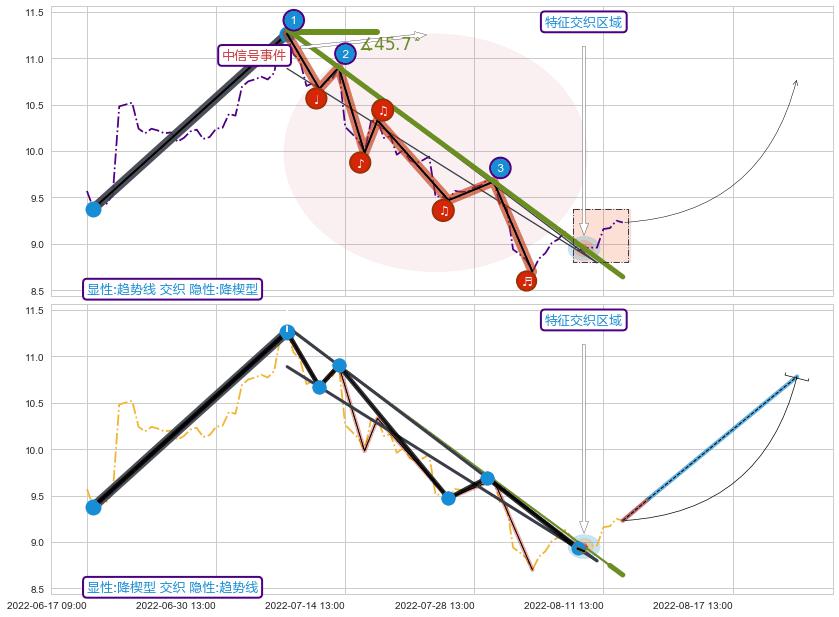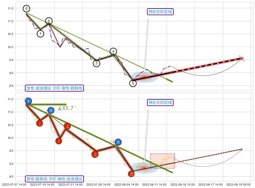 ➢ 2022-07-07 14:00-2022-08-11 14:00下跌趋势存在反转上涨[机会],其原下跌趋势的阻力位(8.64)已被突破[强支撑信号],原下跌趋势角度: 45.7˚