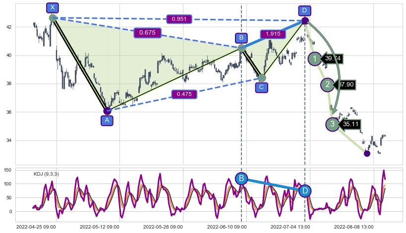 ➢ 谐波价格D点比B点高 ⤴,【KDJ】指标D点比B点低 ⤵️