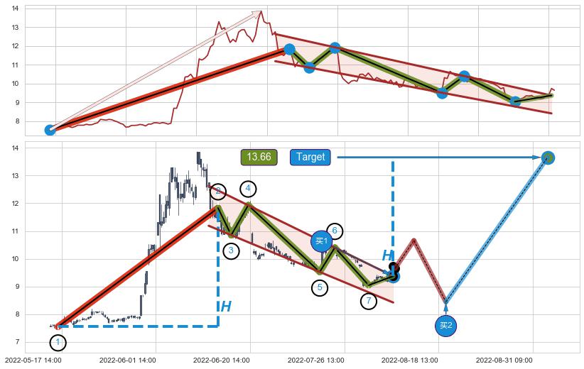 ➣ D点拟合预测价格11.77,距离最后交易收盘价格9.65相差 +22.00%