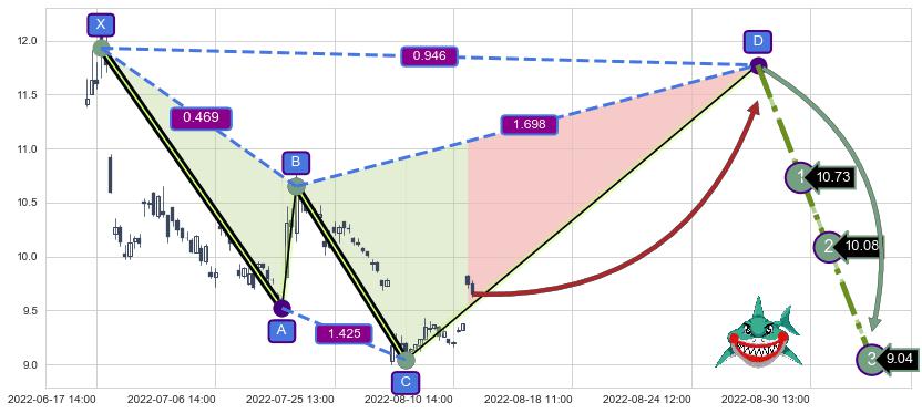 ➢ 未完成【鲨鱼】形态起点X: 06-20:13, 已到达C点: 08-03:14, 预测最终D点: 08-26:14, 共138交易小时
