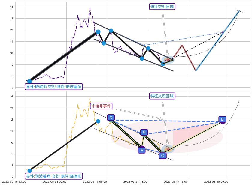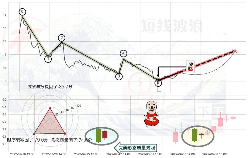 从2022-08-03 14:00至2022-08-12 14:00,共包含15个小时,阶段股价上涨6.65%,阶段股价变动位移路程比: 1 : 2