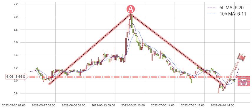 ♘ 支撑价格位6.06,可信任强度68.59%,距离最后交易2022-08-12 14:00形成的收盘价格6.29相差 -3.66%