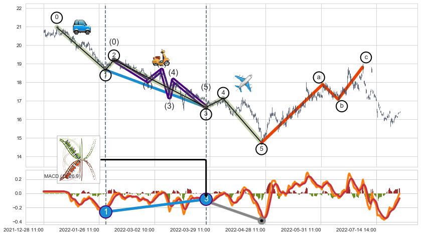 ➣ 波浪理论:猜想达到c点后小反弹终止反转下跌 → 下跌 → 【拐点】临近 → 阶段均值回复结束后继续大周期趋势跟踪