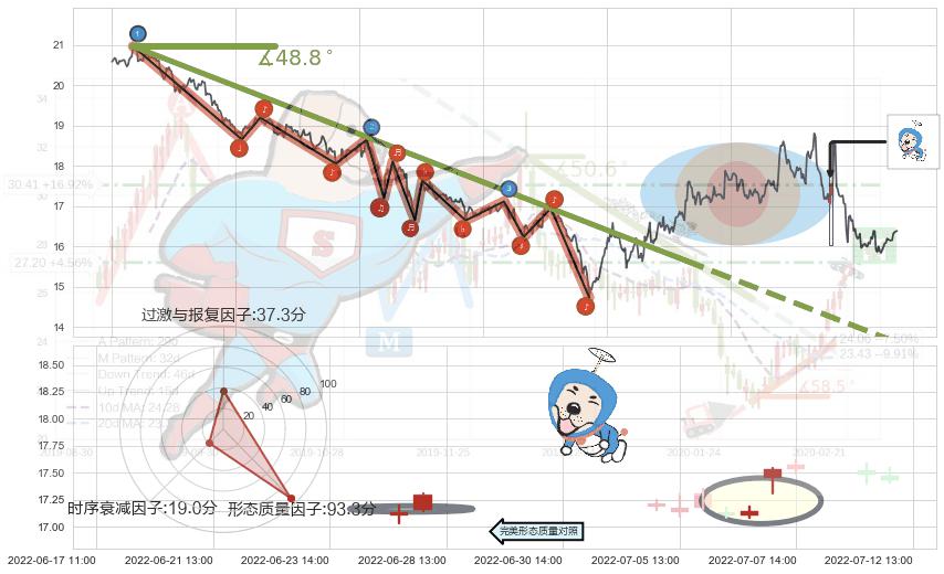 从2022-01-05 10:00至2022-05-23 11:00,共包含447个小时,阶段股价下跌-21.76%,阶段股价变动位移路程比: 1 : 10,下跌趋势角度: 48.8