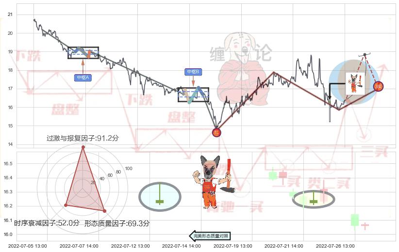 ➣ 【中枢B】:04-08:10-04-19:13,中枢由5笔构成,共38交易小时, ZG=16.94, ZD=16.70