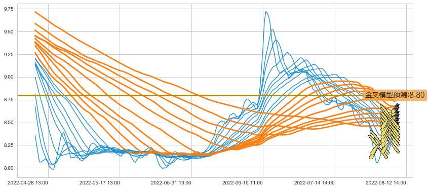 ➣ 45小时均线于(08-10 14:00: 8.49)形成【金叉】基于【金叉历史模型】预测金叉后最高波峰价格: 8.89, 金叉后最高价格8.76,尚未达到预测最高波峰价格, 预期继续上涨