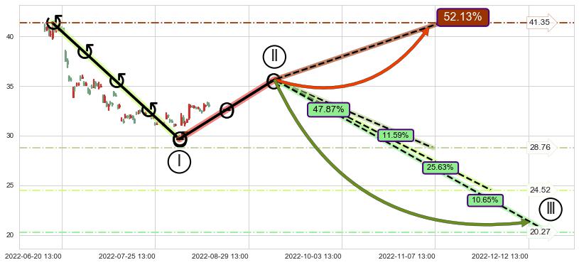 从2022-06-21 14:00至2022-06-27 14:00,共包含9个小时,阶段股价下跌-3.42%,阶段股价变动位移路程比: 1 : 2