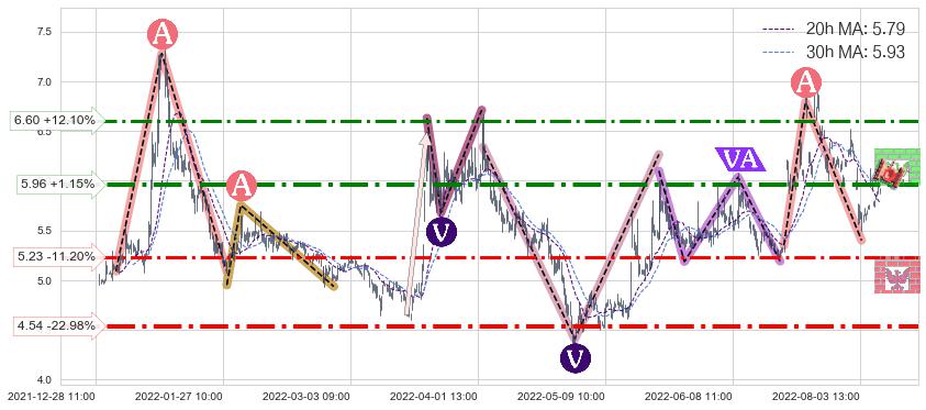 ♘ 阻力价格位5.96,可信任强度82.46%,距离最后交易2022-08-12 14:00形成的收盘价格5.89相差 +1.15%
