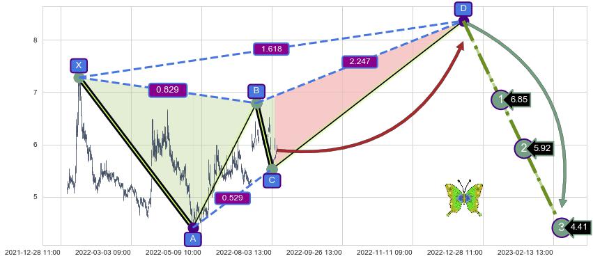 ➣ 谐波蝴蝶:猜想c点下沉接近b点后强支撑来临拉升上涨(均值回复)