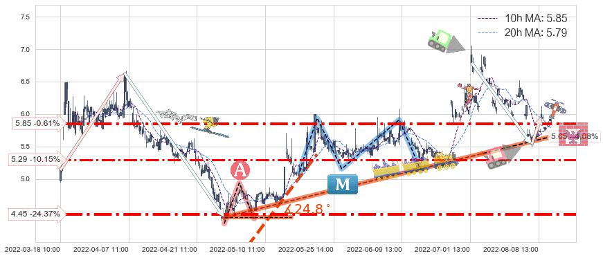 ♘ 支撑价格位5.29,可信任强度69.49%,距离最后交易2022-08-12 14:00形成的收盘价格5.89相差 -10.15%