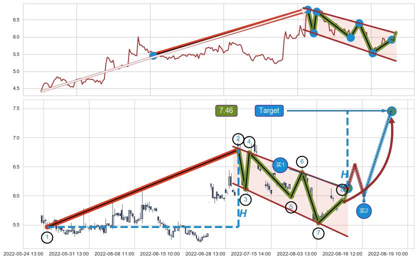 ➢ 支撑位【③⑤⑦】波动逐渐走低,构成【旗形】下平行线
