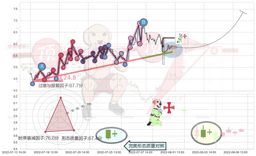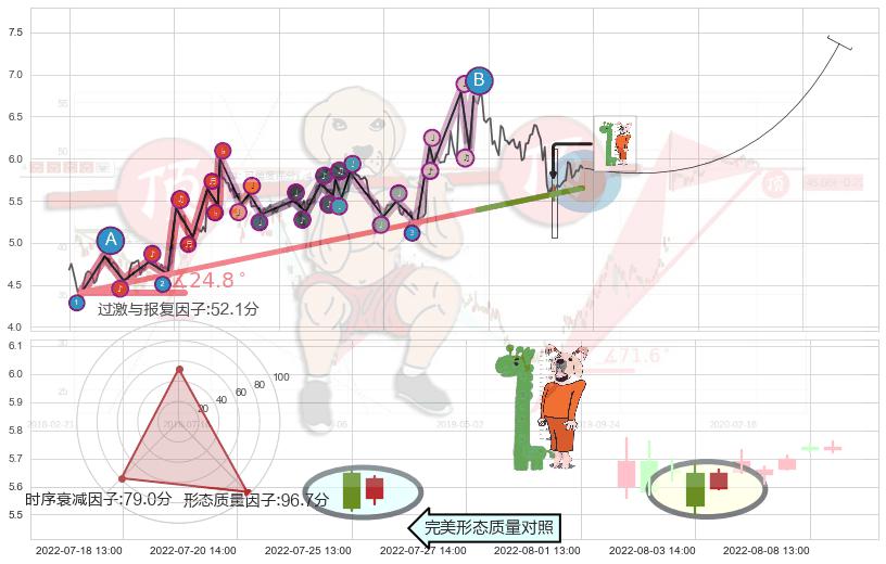 从2022-04-27 11:00至2022-07-08 14:00,共包含190个小时,阶段股价上涨45.98%,阶段股价变动位移路程比: 1 : 5,上涨趋势角度: 24.8,2022-07-07 13:00向⇪形成缺口,跳空上涨+9.95%