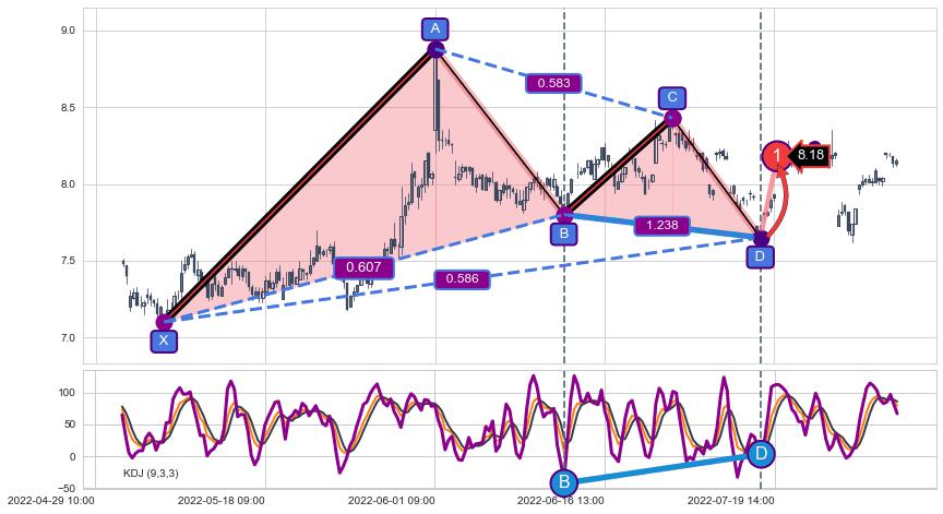 ➢ 谐波价格D点比B点低 ⤵,【KDJ】指标D点比B点高 ⤴️