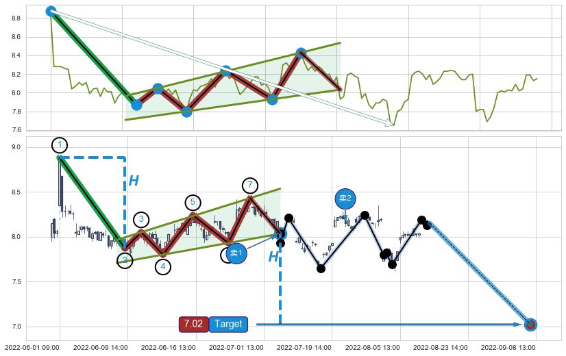 ➣ 最小中继整理跌幅→𝐇: 0.7800 (上平行阻力线与下平行支撑线的垂直距离)