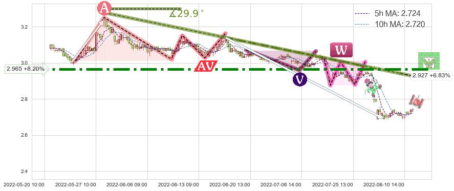 ♘ 阻力价格位2.965,可信任强度92.14%,距离最后交易2022-08-12 14:00形成的收盘价格2.740相差 +8.20%