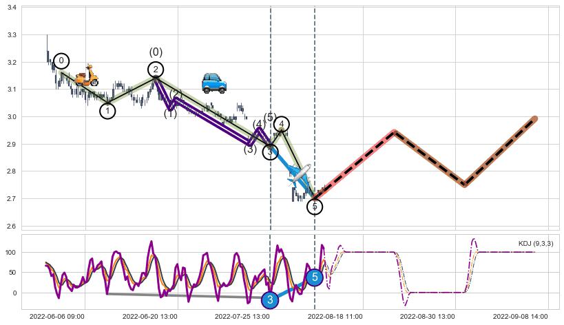 ➢ 第三,五驱动浪端点:【KDJ】走势出现【常规背离 & 反转信号】背离程度99.00%,背离夹角角度97.5˚,背离程度较大