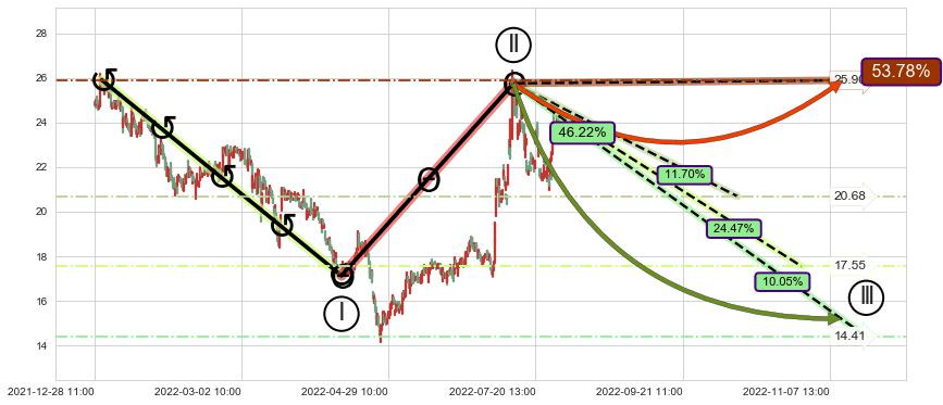 ➢ 循环浪继续向下【最低】位置(11-17:14, 14.41),匹配聚类样本比例21.75%, 可能性概率10.05%