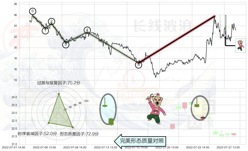 从2022-04-26 14:00至2022-07-12 13:00,共包含201个小时,阶段股价上涨44.13%,阶段股价变动位移路程比: 1 : 5,上涨趋势角度: 19.3