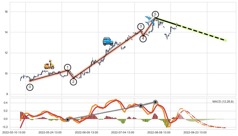 ➣ 趋势线:支撑位已击穿破位,猜想持续向下下沉下跌 → 下跌 →【破位】风险信号 → 大周期均值回复