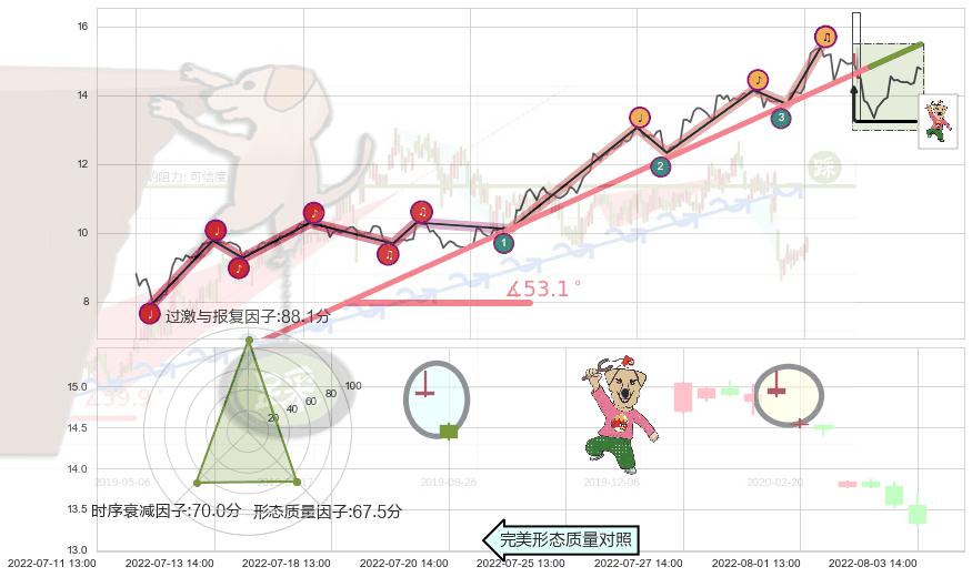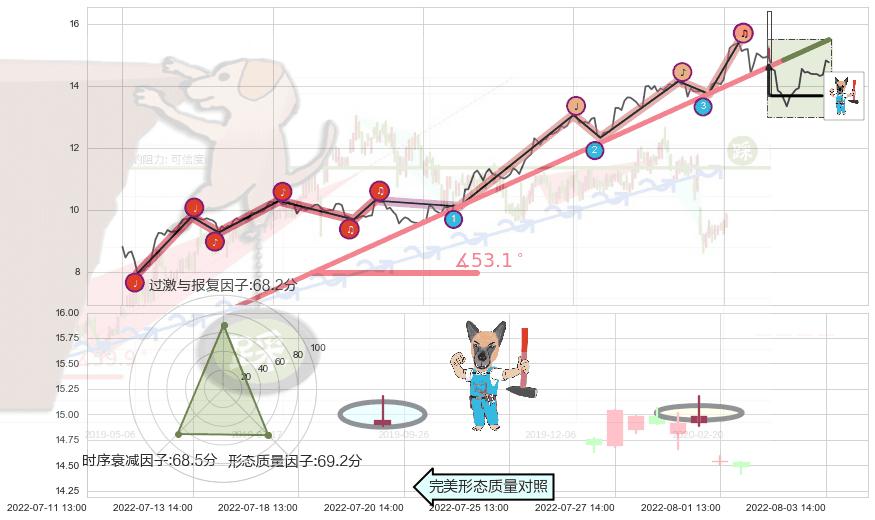 ➢ 2022-04-27 09:00-2022-08-03 13:00上升趋势存在反转[风险],虽然原上升趋势的支撑位(15.48)已破位,但其支撑效果尚存,原上升趋势角度: 53.1˚