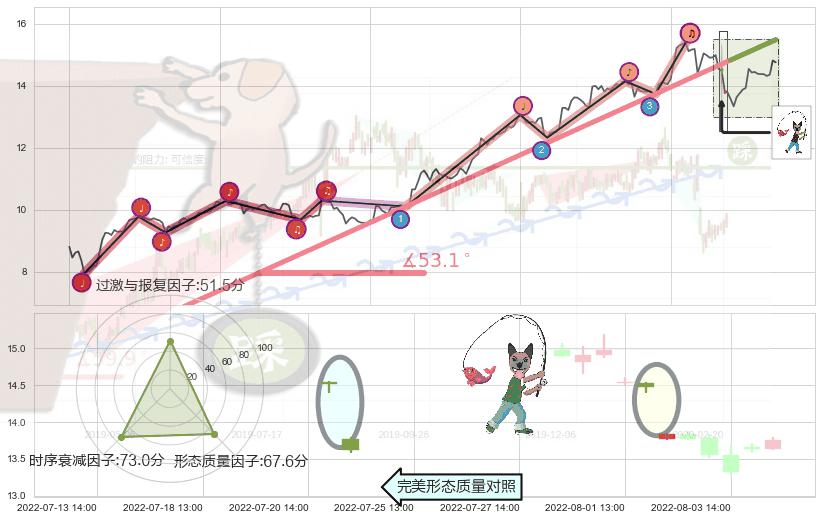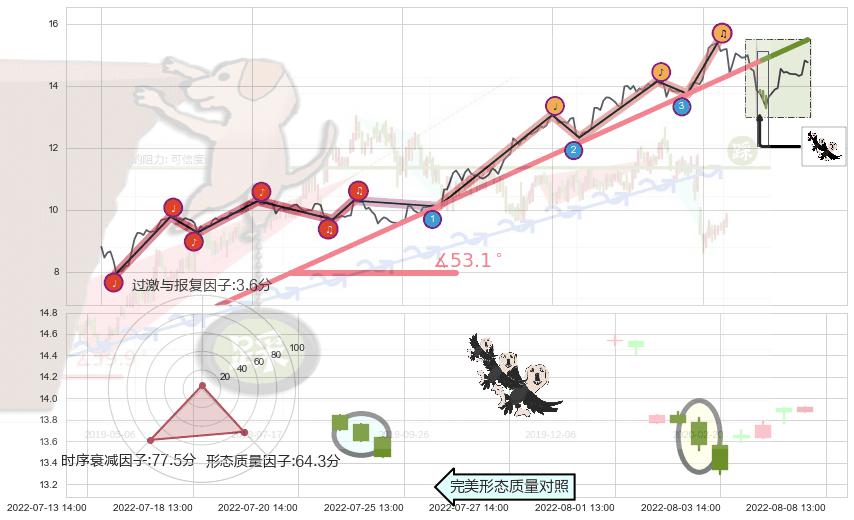 从2022-04-27 09:00至2022-08-03 13:00,共包含216个小时,阶段股价上涨56.12%,阶段股价变动位移路程比: 1 : 3,上涨趋势角度: 53.1
