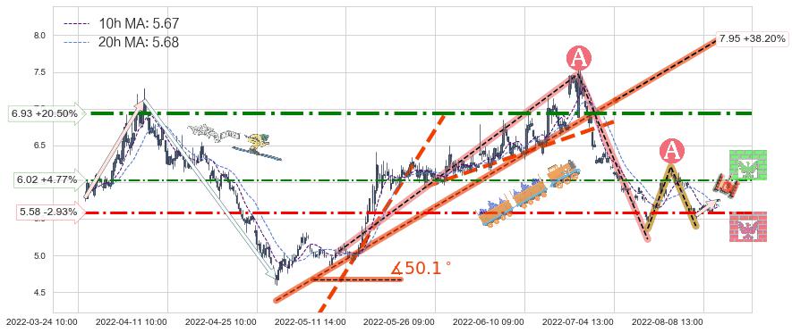 ♘ 阻力价格位6.02,可信任强度43.54%,距离最后交易2022-08-12 14:00形成的收盘价格5.75相差 +4.77%